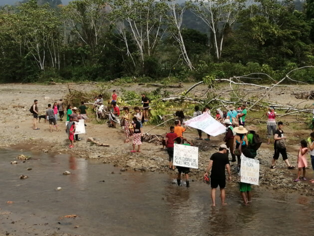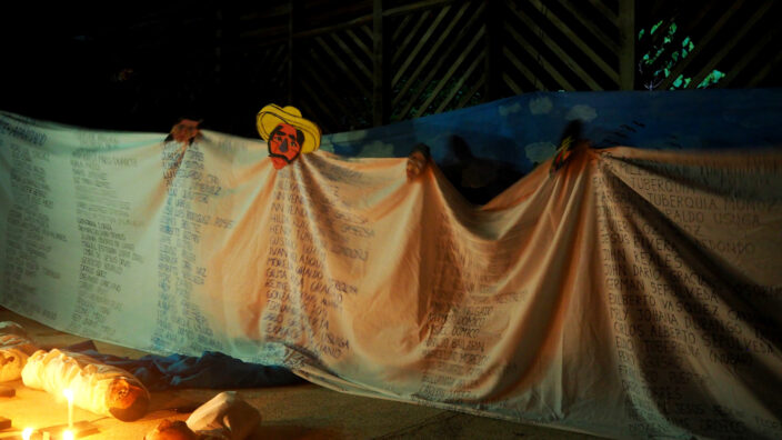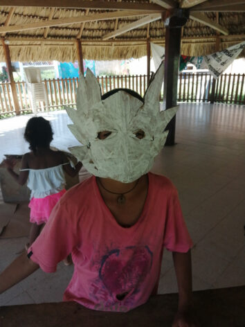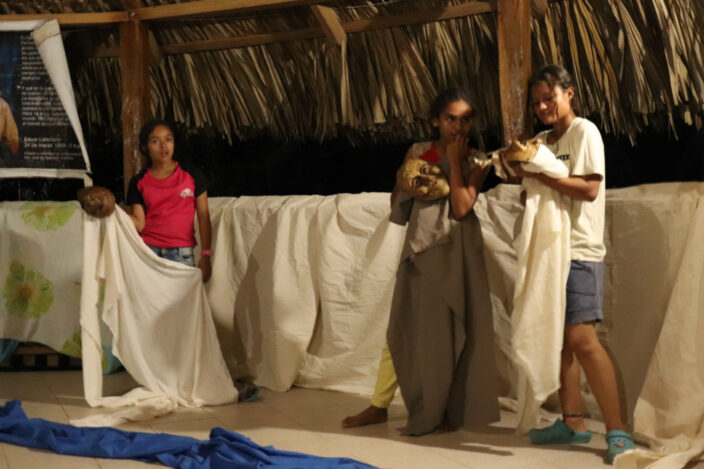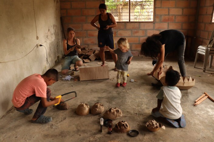 Deux mois avant le voyage, la construction des marionnettes bâtait son plein. Nous voulions que tous les matériaux des marionnettes représentant les peuples autochtones proviennent de la terre, de notre entourage, de la rivière à côté de la maison. Nous voulions l’argile faite masque, et l’iraka fait ventre, la caña brava faite chapeau. Mais nous n’avions jamais fait ça! Après maintes offrandes à la forêts, tentatives vaines et têtes cassées, l’argile et le feu eux-mêmes nous ont guidé pas à pas. Les têtes, les mains, les pieds sont apparus, marqués par la flamme, nés de nouveau dans les cendres.
